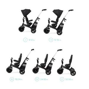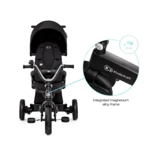 Tricicleta Kinderkraft EASYTWIST, BLACK Plimbarea este pentru un copil o ocazie excelenta de a descoperi lumea din jur. EASYTWIST BLACK este o tricicleta de care se va indragosti fiecare copil ! În timp ce ii asigura copilului o buna distractie, il ajuta sa-si dezvolte abilitatile motorii deja de la varsta de 9 luni! sezutul inovator, dotat cu sistemul pivotant CLICK & TWIST,permite o rotatie completa la 360°, iar bicicleta in sine este usoara si extrem de durabila – datorita unui cadru solid din aliaj de magneziu. Plimbarea cu aceasta tricicleta ajuta, de asemenea, la stapanirea echilibrului, sustine coordonarea motorie si invata un comportament corect si sigur in afara casei. EASYTWIST BLACK este o tricicleta 5 in 1 – datorita constructiei sale modulare poate fi modificata si ajustata la varsta si inaltimea copilului. Avantaje Siguranta Rotile tricicletei sunt fabricate din PU – sunt puternice si durabile – practic impenetrabile. Au o rezistenta crescuta la abraziune. Rotile din spate sunt, de asemenea, echipate cu rulmenti, si de aceea sunt perfecte pentru orice suprafata. Confortabil de utilizat, bara fixata protejeaza copilul impotriva caderii. Element protector al rotii din fata pentru a proteja picioarele copilului in timpul mersului. Centuri de siguranta in 5 puncte cu elemente protectoare moi (pentru centura dintre picioare). Blocaj care permite pedalarea fara propulsarea rotii. Îndeplineste standardul european EN-71. Franele (cate una pe fiecare roata) impiedica deplasarea accidentala a tricicletei. Confort Copertina rabatabila care protejeaza copilul de soare si vant (impermeabila, cu UPF 50+). Maner reglabil pentru parinte (de la 84 cm la 107 cm). Manerul poate fi setat pe 4 niveluri. Manevrarea usoara a tricicletei in timpul mersului cu ajutorul manerul dedicat pentru parinte. Manerele antiderapante din cauciuc asigura o prindere sigura pentru copil. Husa detasabila a scaunului poate fi spalata in masina de spalat rufe. Functionalitate Scaun CLICK & TWIST rotativ la 360°. Tricicleta creste odata cu copilul – structura modulara face posibila modificarea produsului pentru a-l potrivi la varsta micului utilizator (5 optiuni de setare!). La tricicleta sunt atasate accesorii suplimentare, cum ar fi un cos pentru maruntisurile copilului, un sac-rucsac si un suport pentru o cana sau o sticla de apa. Usurinta cu care se poate face demontarea anumitor elemente, face ca EASY TWIST BLACK sa fie foarte usor de transportat. Accesorii suplimentare Sac-rucsac Cos pentru maruntisuri Suport pentru cana Sonerie Fabricatie Materiale Cadru fabricat din aliaj ultra-usor si durabil de magneziu Material poliester nealergen, cu uscare rapida, rezistent la abraziuni si conditii meteorologice Roti PU Dimensiuni inaltime (maner parinte) 107 cm inaltime (bicicleta cu copertina) 130 cm latime (roata din fata) 34 cm inaltime (roata din fata) 25,4 cm inaltime (roata din spate) 20,3 cm Greutate 10 kg Dimensiuni ambalaj/ greutate 73 x 43 x 28,5 cm/11,8 kg