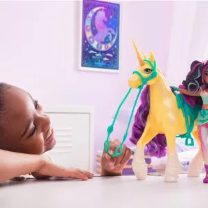 Creeaza acasa aventuri fermecatoare Academia Unicorn cu papusile la moda Sophia, Ava si Isabel. Inspirate din serialul animat NETFLIX si din seria de carti de succes in care prietenia tine fraiele, aceste papusi de 24,1 cm pentru fete dau viata personajelor. Frumos detaliata din cap pana in picioare, personalitatea efervescenta a Avei iese la iveala in parul ei cu suvite (accesoriu de coafat inclus) si in tinuta ei caracteristica de calaret de unicorn rochia roz si albastru-verzui, pantaloni ombre cu marcaje Magia plantelor, cizme florale si agrafe de par, manusi si accesorii pentru papusi cu centura cu fluturi. Cu 9 puncte de articulatie, pozitioneaz-o pe Ava in timp ce protejeaza Insula Unicornului si magia sa si calareste in aventura cu unicornul ei, Leaf (vandut separat). Legaturile magice dintre elevii Academiei Unicorn si unicornii lor vor starni povesti pline de imaginatie. Pentru mai multe moduri de a experimenta Academia Unicorn alaturi de personajele tale preferate, cauta papusile Sophia si Isabel si unicornii lor, Wildstar Lumina Curcubeului si River (suvoi) (fiecare se vinde separat) si extinde-ti lumea. Pentru copiii carora le plac unicornii si jucariile cu cai, papusile si accesoriile, jocurile de casa de papusi, jucariile de colectie, jucariile de plus si multe altele, jucariile Academia Unicorn sunt cadouri distractive de de ziua de nastere pentru fete sau cadouri pentru orice ocazie.