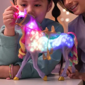 Descopera-ti destinul cu Wildstar Lumina de Curcubeu de la Academia Unicorn. Inspirat de serialul animat NETFLIX si de seria de carti de succes, acest unicorn interactiv de 27,9 cm raspunde la atingere cu lumini curcubeu, efecte sonore si cantece din serial. Cu marcaje luminoase de Magia luminii, coama si coada curcubeu si multe altele, copiii pot recrea momentul magic al legaturii cu Wildstar din serial. Mangaie-i fata lui Wildstar, atinge-i cornul si trage-i fraiele pentru a vedea cum reactioneaza. Pe masura ce legatura voastra se consolideaza, luminile albe ale lui Wildstar stralucesc mai tare, transformandu-se in curcubeu atunci cand ii castigi increderea. tine-i fata pentru a completa legatura si o vei auzi pe Wildstar sarbatorind cu melodia generic din serial. Dupa crearea legaturii, tine-i fata lui Wildstar pentru a reda muzica, atinge-i cornul pentru a te ghida cu lumina si multe altele. Pozitioneaz-o pe Sophia (papusa vanduta separat) si calareste spre aventura. Extinde-ti lumea Academia Unicorn cu papusile la moda si unicornii (fiecare se vinde separat). Pentru copiii carora le plac unicornii si jucariile cu cai, papusile si accesoriile, jocurile de casa de papusi, jucariile de colectie, jucariile de plus si multe altele, jucariile Academia Unicorn sunt cadouri distractive de ziua de nastere pentru fete sau cadouri pentru orice ocazie. Necesita 2 baterii AA si are melodii in limbile Engleza, Franceza si Spaniola. Traieste o experienta extraordinara cu Wildstar Lumina de Curcubeu.