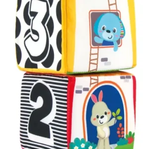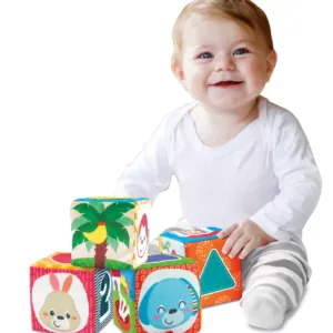 Setul de 4 cuburi de stivuit multicolore din material textil perfect pentru bebelusi. Aceste cuburi moi si placute la atingere ofera ore intregi de distractie garantata. Fiecare fata a cubului prezinta o noua activitate captivanta pentru cei mici. Unul dintre cuburi are functie de vibratie, altul include o oglinda speciala sigura pentru bebelusi, ceea ce adauga un plus de atractie si explorare. Cuburile pot fi stivuite cu usurinta, iar materialul moale din care sunt confectionate asigura ca bebelusii nu se vor rani in timpul jocului. Setul include animale distractive, forme, numere si activitati de numarare, oferind astfel o gama variata de stimuli vizuali si tactili pentru dezvoltarea armonioasa a celor mici. De asemenea, cuburile includ un puzzle simplu si o oglinda sigura pentru bebelusi, incurajand explorarea si dezvoltarea perceptiei vizuale. Distractia cu stivuirea si rasturnarea cuburilor contribuie la dezvoltarea coordonarii mana-ochi si a abilitatilor motorii fine ale bebelusului. Setul de cuburi este recomandat pentru bebelusi incepand de la varsta de 6 luni, fiind un partener ideal pentru primele etape de joaca si descoperire. Aceste cuburi sunt o alegere excelenta pentru parintii care doresc sa le ofere copiilor lor jucarii sigure, captivante si educative, contribuind astfel la dezvoltarea lor si la crearea unor momente de joaca pline de bucurie si invatare.